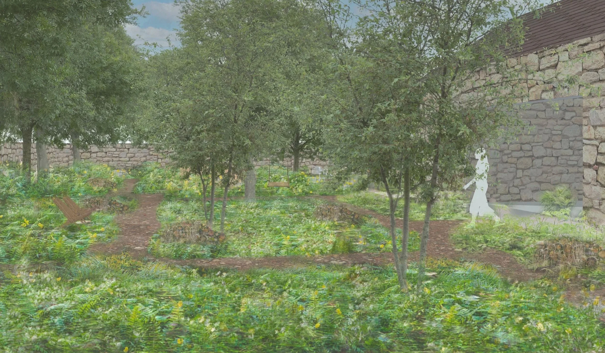 The planting scheme has been carefully designed to bring variety and interest. Open, sunny areas feature bold, architectural plants in a warm palette of golds, yellows, and deep earthy reds. In contrast, the woodland garden offers a softer atmosphere, with delicate species in calming shades of white, pink, and green.